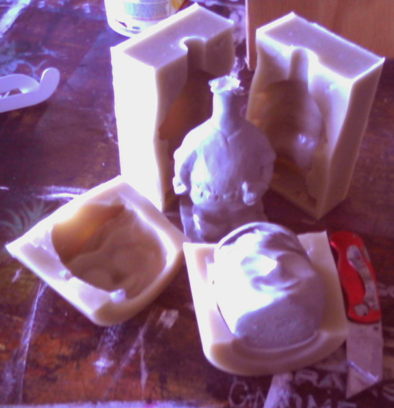 Astfel echipati, amestecati cele doua parti, stropiti recipientul cu silicon de presa si se toarna amestecul peste sculptura. Lasati-l sa se inchege intareasca peste noapte si – shazam – tocmai am facut un tipar. In dimineata urmatoare trageti tiparul afara din forma. Asigurati-va ca ati uitat complet modul in care ati vrut sa taiati tiparul, astfel incat sa puteti face o apreciere justa in ceea ce priveste directia in care trebuie sa taiati si rugati-va sa fi fost bine. Ura! Cinci sau sase tipare ale acestor trei statuete. Din fericire, cea care era gresita nu mai conteaza oricum. Ar fi putut fi facute si mai bine.(40$ / 4ore.)